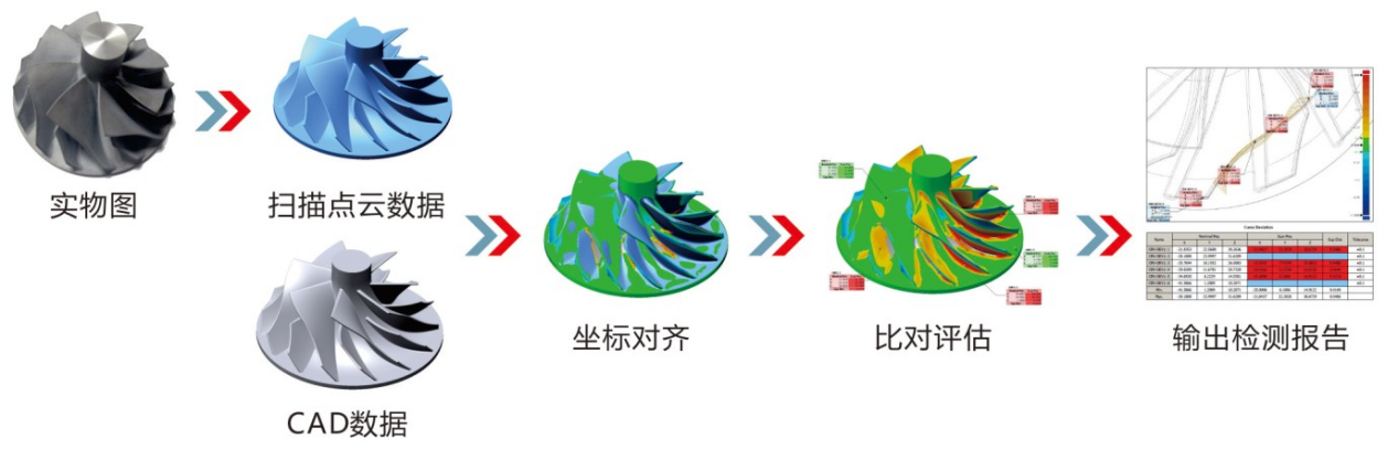 通過三維掃描技術可以獲得汽車零部件的點云數據,將獲得的點云數據和零部件原始的CAD數據進行比較,可以輕松獲得各個位置的偏差值,為大曲面,結構復雜的部件質量檢測提供了好的解決方案。